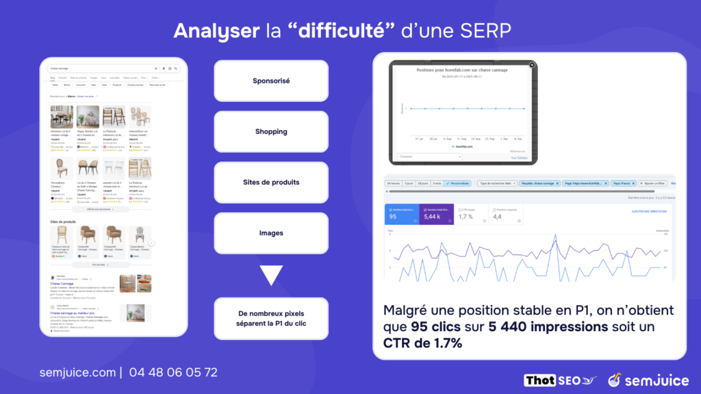 L’exemple de la requête « chaise cannage » (analysé lors d’un webinaire Semjuice en septembre 2025 avec Damien Oulagnon et Paul Grillet de Thot SEO) illustre parfaitement cette réalité.
