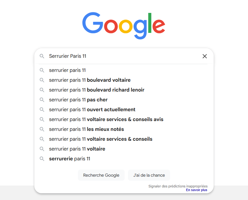 Un utilisateur tape « serrurier paris 11 » → Google Suggest propose :