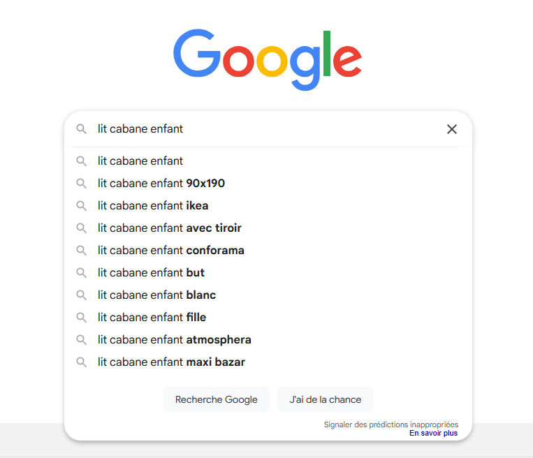 Un utilisateur commence à taper « lit cabane enfant » → Google Suggest propose « lit cabane 90×190 », « lit cabane enfant avec tiroir », « lit cabane enfant blanc ».