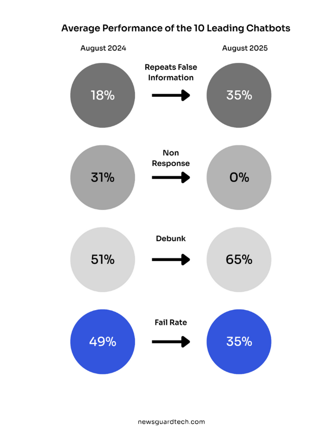 Selon NewsGuard, le taux de non-réponse (sur des requêtes ciblant l’actualité et les informations circulant dans les médias) des 11 principaux chatbots est passé de 31 % en août 2024 à 0 % en août 2025. Dans le même temps, le taux de fausses informations a doublé : de 18 % à 35 %.