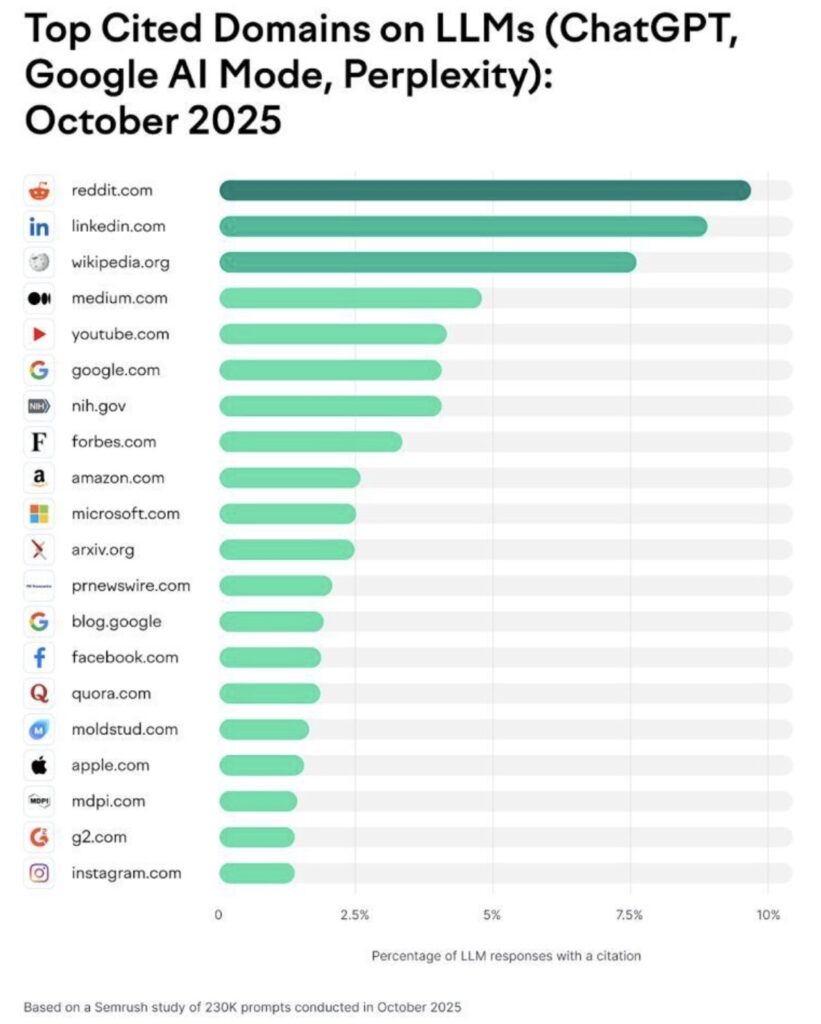 Une étude SEMrush publiée en octobre 2025 a analysé 230 000 requêtes sur ChatGPT, Google AI Mode et Perplexity. Résultat : LinkedIn arrive en deuxième position des domaines les plus cités, dans le sillage de Reddit.