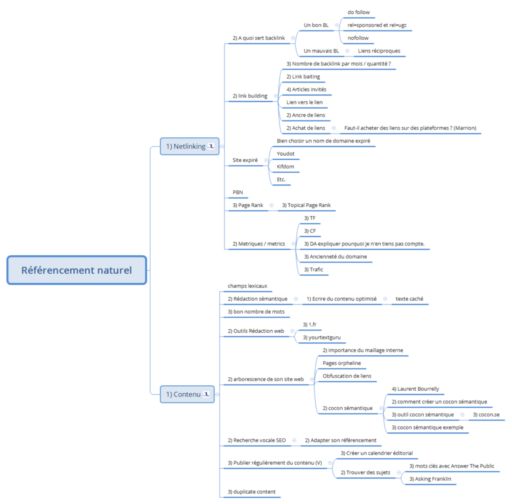 Exemple de structure et de niveaux pour la thématique du référencement naturel